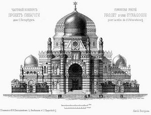 • Конкурсный проект синагоги в Санкт-Петербурге работы Л. И. Бахмана и И. И. Шапошникова, 1879 («Зодчий», СПб, 1881)