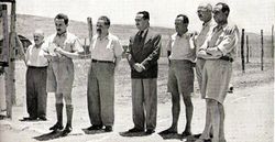 Давид Ремез, Моше Шарет, Ицхак Гринбойм, Дов Йосеф, м-р Шенкарский, Давид ха-Коэн, Иссер Харель в лагере Латрун после ареста в ходе операции «Черная суббота» (1946)