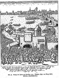 Тогда, 22 августа 1614 г., разразился погром, чернь напала на еврейский квартал, жители которого самоотверженно защищались; однако одни из ворот были взломаны, и на протяжении 13 часов погромщики грабили и разоряли еврейские дома. 1380 евреям, собравшимся на кладбище, было разрешено покинуть город под охраной вооруженных мещан. Вновь вмешался император и, подавив бунт, велел казнить зачинщиков погрома пряничника Винцента Феттмильха и его подручных; евреи возвратились в город в сопровождении войска.