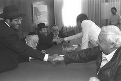Лидеры Ликуда и Агудат Исраэль после коалиционных переговоров (3 ноября 1988 г.). Фото Я. Са‘ара. Государственное бюро печати. Израиль.