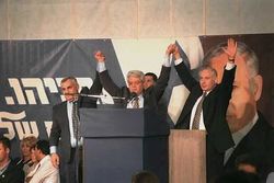 Слева направо: И. Мордехай, Д. Леви и Б. Нетанияху приветствуют своих сторонников, работавших в предвыборном штабе Ликуда в ночь выборов в Кнесет 14-го созыва (29 мая 1996 г.). Фото А. Охайона. Государственное бюро печати. Израиль.