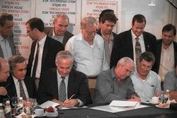 Глава Ликуда Б. Нетанияху (сидит третий справа) и председатель партии Цомет Р. Эйтан (сидит второй справа) подписывают соглашение о формировании общего списка на выборах в Кнесет 14-го созыва (8 февраля 1996 г.). Фото Я. Са‘ара. Государственное бюро печати. Израиль.
