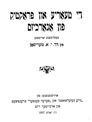 • מעריסאָן יעקב-אברהם. די טעאָריע און פּראַקטיק פון אַנאַרכיזם, געקליבענע שריפטען. ניו-יאָרק, 1927. - Мэрисон Яаков-Авраам. Ди теорие ун практик фун анархизм, геклибене шрифтен (Теория и практика анархизма, избранные сочинения). Нью-Йорк, «Найе гезелшафт ун Ферер Сентер брентчес фун Арбетер Ринг», 1927.