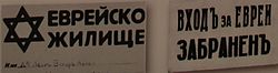 Согласно болгарским антисемитским законам на еврейские дома были повешены указатели их принадлежности (слева). Везде, где евреям был вход запрещён, висел знак, ограничивающий доступ (Справа). Снимок сделан в Музее Холокоста в Скопье, Республика Македония