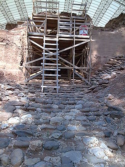Чтобы дойти до ворот с запада, надо было подняться по каменным ступенькам, двадцать из которых сохранились и по сегодняшний день. Когда врата были обнаружены, они были почти полностью покрыты землёй. Во время раскопок были обнаружены поддерживающие стены, которые были созданы, скорее всего, для упрочнения структуры ворот. Предполагается, что городские ворота использовались на протяжении одного или двух поколений жизни города, впоследствии ворота были закрыты, засыпаны землёй и стали частью наружной стены.