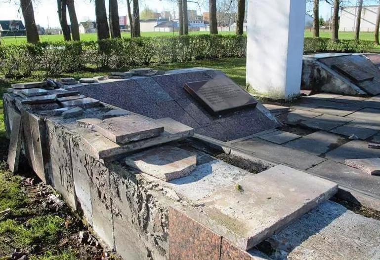 Мемориал евреям Вилкавишкиса, погибшим в Холокосте, на местном кладбище, повреждённый вандалами.