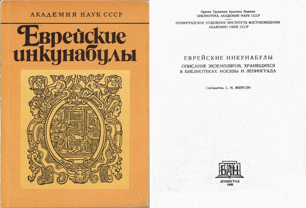 Обложка и титульный лист издания «Еврейские инкунабулы». Ленинградское отделение Института востоковедения АН СССР. Ленинград, 1988 г.