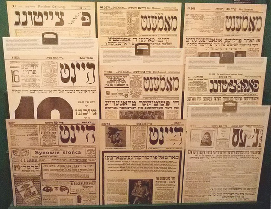 Газеты «Хайнт», «Момент», «Пинскер цайтунг», «Фолкс-цайтунг» и «Хайнтике найес». Стенд идишской прессы в Музее истории польского еврейства «Полин» в Варшаве. Фото: Ш. Кидрон, 2015 г.