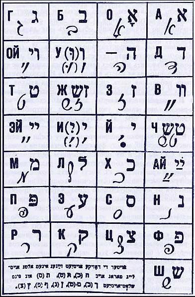 Алфавит языка идиш с русской транслитерацией букв. Из книги Л. Квитко «Алефбейс», 1947. Снимок этой страницы распространялся еврейскими активистами среди евреев СССР в 1950-х гг.
