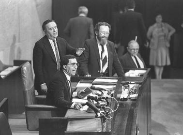 Председатель Кнесета М. Савидор и один из его заместителей М. Шахал во время дебатов о назначении досрочных выборов. 1984 г. Фото Г. Ханании. Государственное бюро печати. Израиль.