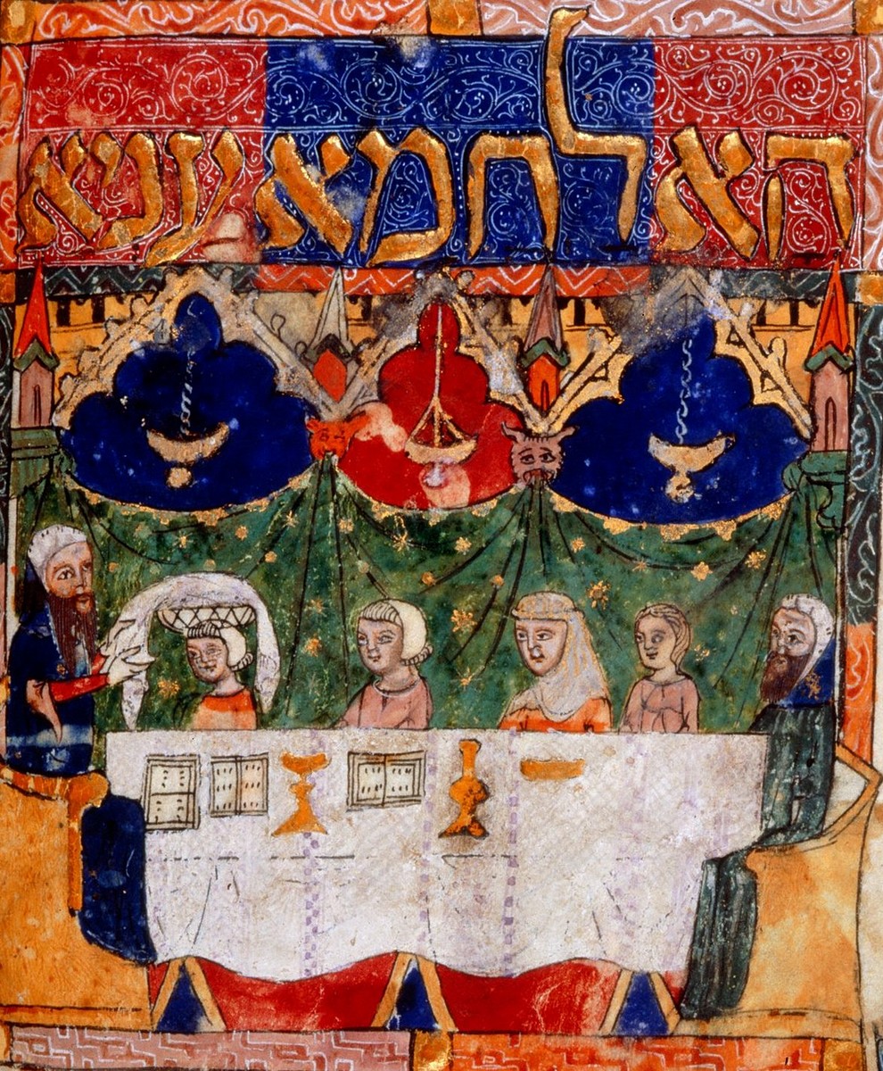 Пасхальный седер. Иллюстрация из «Барселонской hагады». Ок. 1340 г. Каталог иллюстрированных рукописей Британской библиотеки.