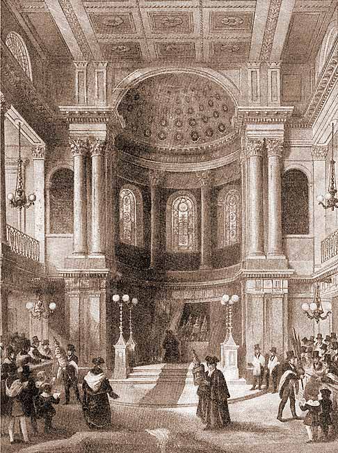Интерьер Новой синагоги. Лондон. Начало 19 в. Гравюра. Jewish Encyclopedia (1901–1912).