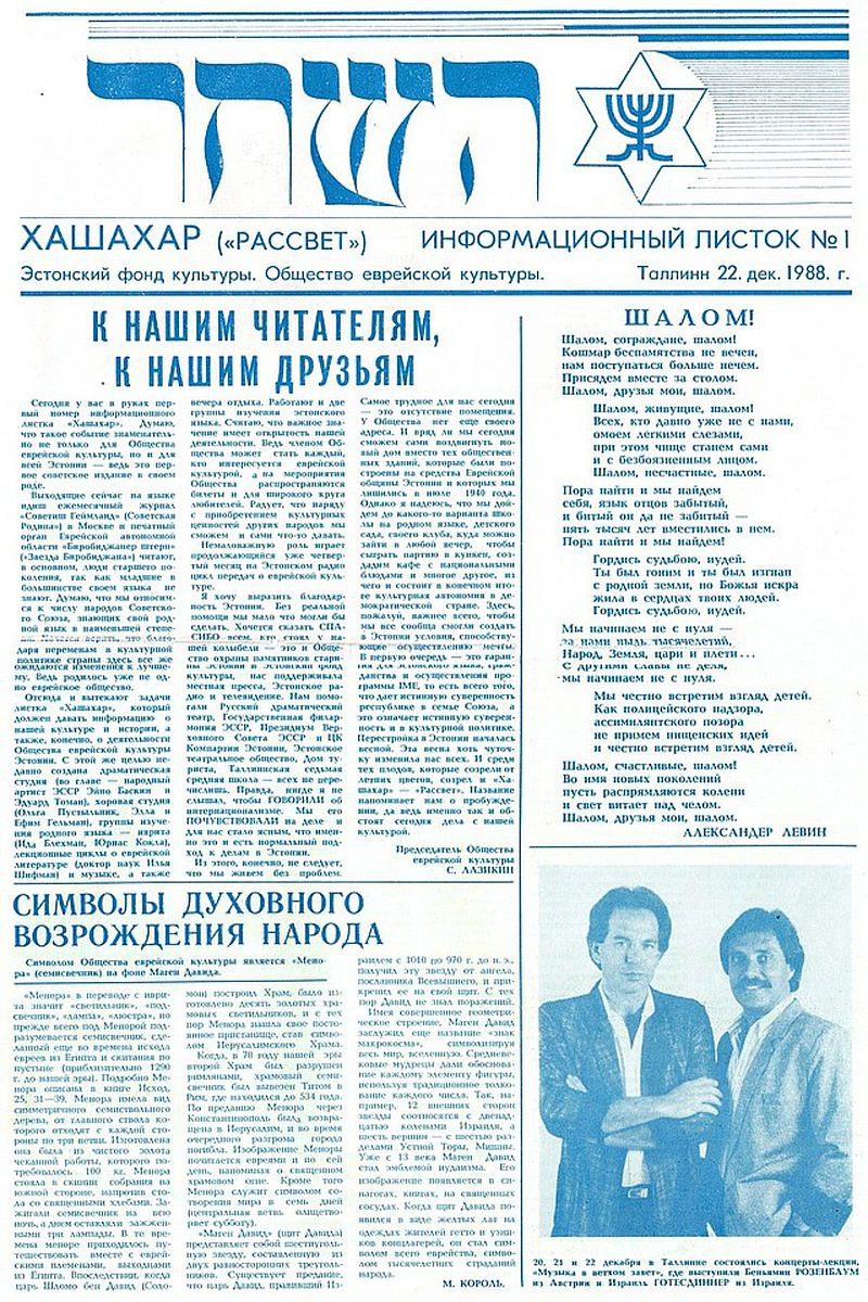 Первая страница первого номера русскоязычной версии газеты «Ха-Шахар», органа Общества еврей­ской культуры Эстонии. Таллинн, 22 декабря 1988 г.