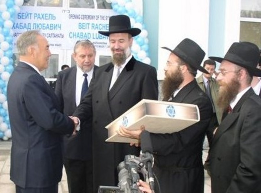 Президент Казахстана Н. Назарбаев (слева) оставляет первую запись в гостевой книге новой синагоги «Бейт Рахель — Хабад Любавич», в Астане. Фото казахстанского еврейского центра «Хабад Любавич». 2004.