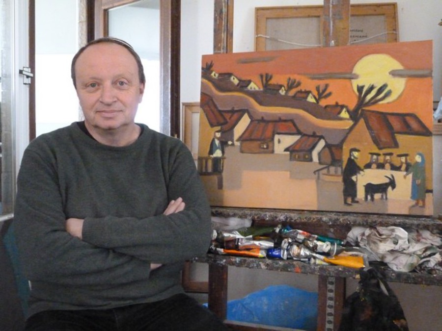 М. Яхилевич у эскиза декорации к спектаклю «Зачарованный портной» (1988), Ма‘але-Адуммим, 2016. Фото: А. Эпштейн.