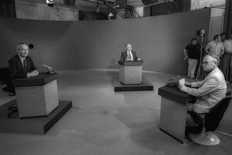 Телевизионные дебаты премьер-министра М. Бегина с лидером оппозиции Ш. Пересом. В центре – военный корреспондент «Ха-Арец» З. Шиф (1981 г.). Фото М. Мильнера. Государственное бюро печати. Израиль.