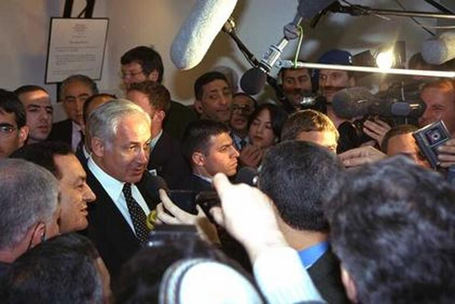 Премьер-министр Израиля Б. Нетанияху и президент Египта Х. Мубарак в окружении журналистов после встречи в Давосе, Швейцария (1997 г.). Фото А. Охайона. Государственное бюро печати. Израиль.