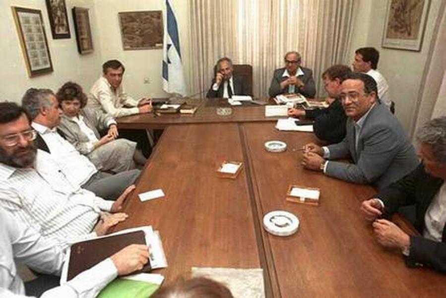 Представители Союза учителей средних школ встречаются с министром финансов Ш. Пересом и министром образования И. Навоном. 1989 г. Фото Ц. Исраэли. Государственное бюро печати. Израиль.