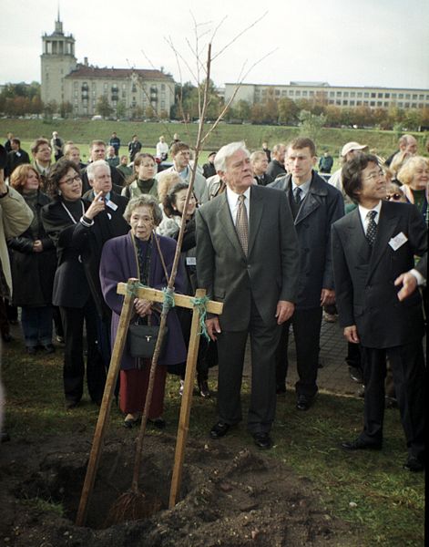 Вдова Сугихары и президент Литвы Адамкус на церемонии посадки дерева в Вильнюсе в 2001 году.