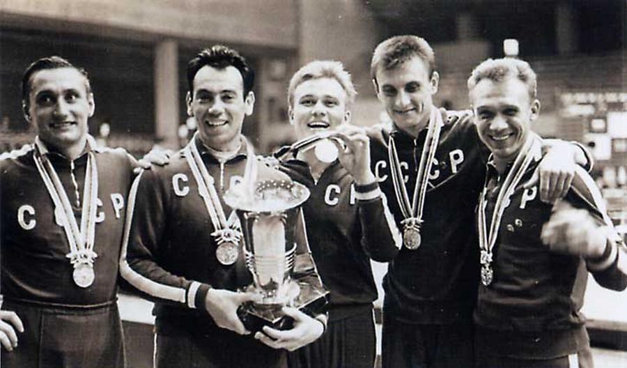 Советская команда фехтовальщиков – золотой призер Олимпиады в Токио, 1964 г. Второй слева – М. Мидлер. Из книги М. Наора «Еврейский народ в 20 веке. История в фотографиях», Иер.-Т-А, 2001.