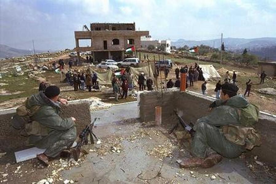 Солдаты Армии обороны Израиля напротив палаточного городка, разбитого арабами, протестующими против строительства еврейского района Хар-Хома в Восточном Иерусалиме. 1997 г. Фото А. Охайона. Государственное бюро печати. Израиль.