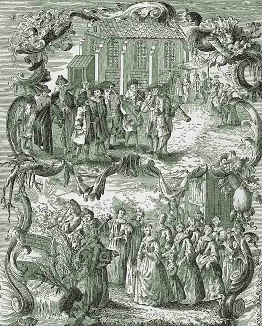 Свадебная процессия у немецких евреев. 18 в. Из книги Й. Боденшатца «Религиозные обряды и обычаи современных евреев», 1748. Jewish Encyclopedia (1901–1906).