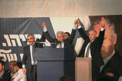 Слева направо: И. Мордехай, Д. Леви и Б. Нетанияху приветствуют своих сторонников, работавших в предвыборном штабе Ликкуда в ночь выборов в Кнесет 14-го созыва (29 мая 1996 г.). Фото А. Охайона. Государственное бюро печати. Израиль.