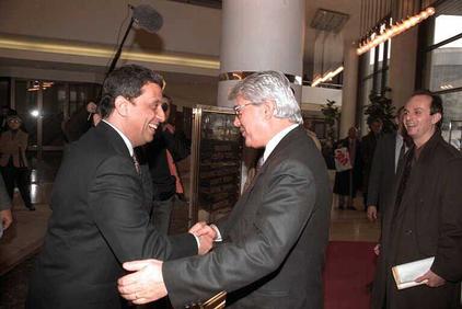 Министр иностранных дел Израиля Д. Леви (справа) на встрече у египетского министра иностранных дел А. Мусы на встрече в Москве (29 января 1992 г.). Фото Я. Са‘ара. Государственное бюро печати. Израиль.