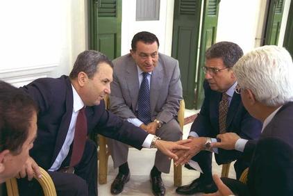 Премьер-министр Израиля Э. Барак (первый слева) и министр иностранных дел Д. Леви (первый справа) встречаются с египетским президентом Х. Мубараком (второй слева) и министром иностранных дел Египта А. Мусой в президентском дворце в Александрии (29 июля 1999 г.). Фото М. Мильнера. Государственное бюро печати. Израиль.