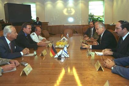Премьер-министр Израиля Б. Нетанияху (справа, в центре) встречается в своей иерусалимской канцелярии с министром обороны ФРГ Р. Волкером (3 сентября 1996 г.). Фото Ц. Исраэли. Государственное бюро печати. Израиль.