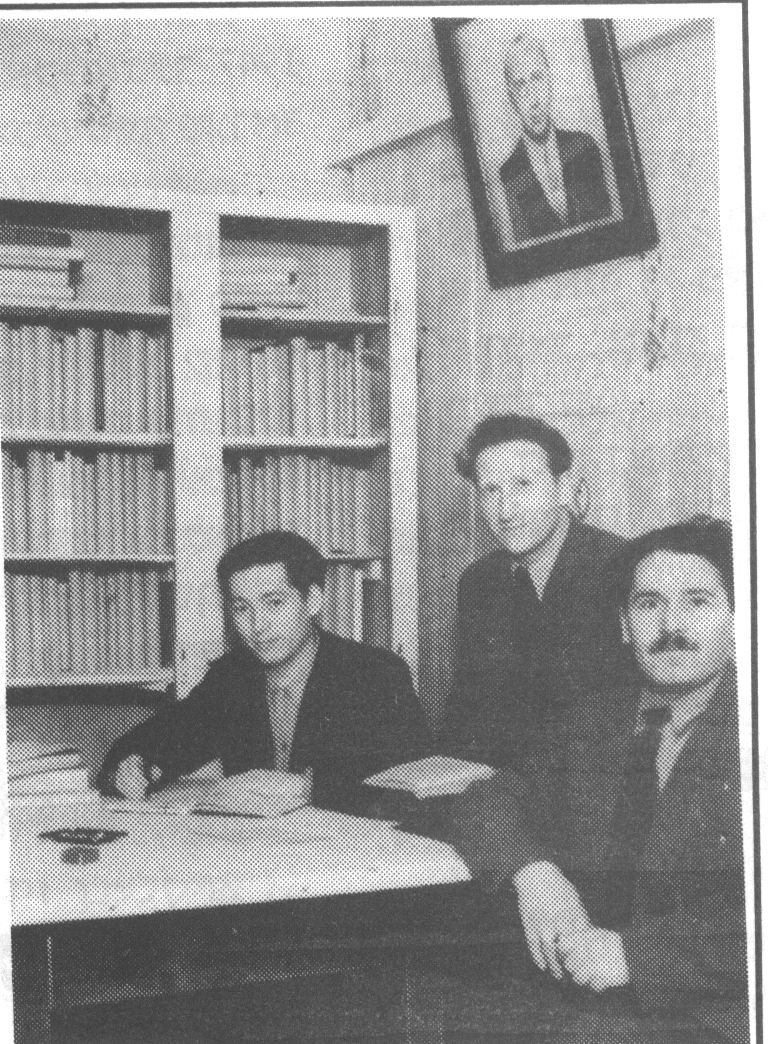 Групповой снимок: трое бундовцев в помещении библиотеки им. Мендельсона в лагере для перемещенных лиц Бад-Рейхенхал, Германия. Первый слева - М. Айзенбуд (ок. 1949 г.).