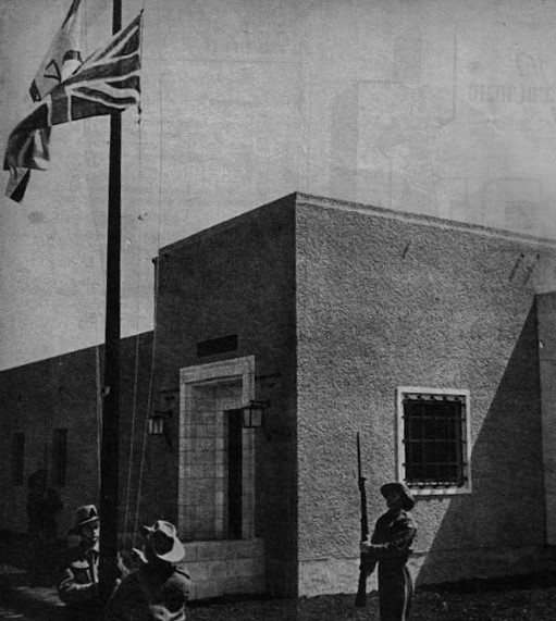 Подъём еврейского флага рядом с британским в 1945 году бойцами полиции еврейских поселений.