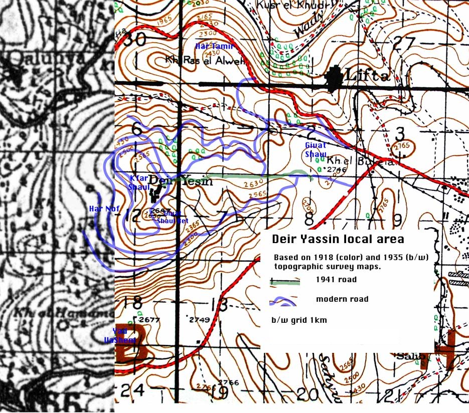 This map is based on a British army topographic map at 1:63,360, dated 1918 (the color portion), plus a British topographic map at 1:100,000, dated 1941 (the black and white portion). The two parts don't join exactly due either to map inaccuracy or the alteration of the roads. I have also shown the main additional roads in 1941 (green) and some of the modern roads (blue). The words in blue are modern suburb names. The actual site of Deir Yassin is now the Kfar Shaul psychiatric hospital.
