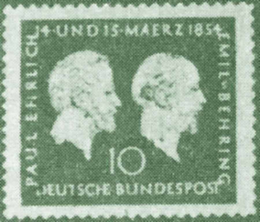 Почтовая марка, выпущенная в Германии в честь присуждения Нобелевской премии по медицине и физиологии. Слева — П. Эрлих.