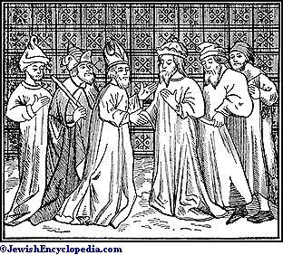 Конференция раввинов Франции. XIII век. Миниатюра из Национальной библиотеки, Париж. Источник: Jewish encyclopedia