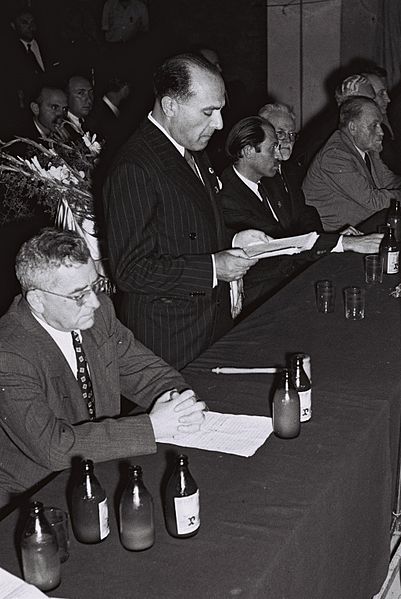 Меир Гроссман сидит справа от оратора, Аарона Цви Пропеса.