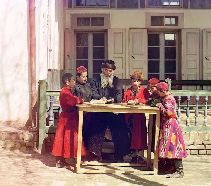 Еврейские дети с учителем в Самарканде, 1910-е годы. Фото С.М. Прокудина-Горского из Библиотеки Конгресса США.