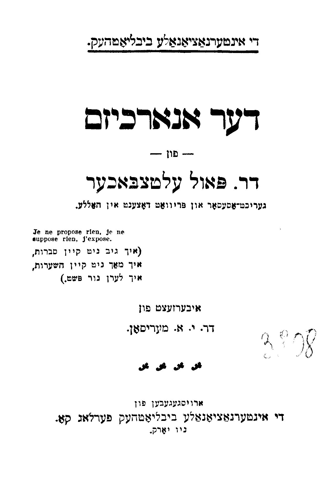 перевод Я.-А. Мэрисона с немецкого на идиш трактата Пауля Эльцбахера "Анархизм"