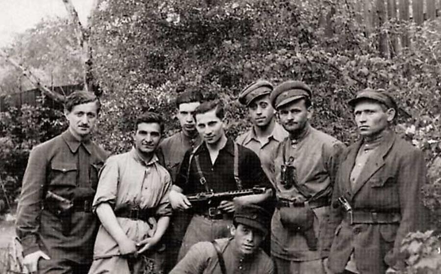 Группа партизан-евреев в лесу близ Каунаса. Из книги М. Наора «Еврейский народ в 20 веке. История в фотографиях», Иер.–Т-А, 2001.