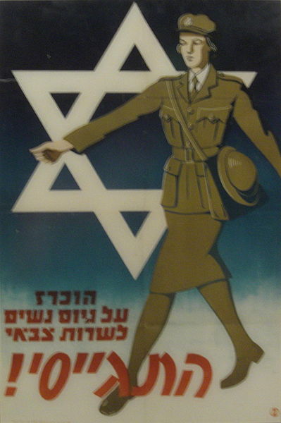 Плакат Хаганы, призывающий женщин призываться в армию. Надпись на плакате: Объявлено о призыве женщин на военную службу. Мобилизуйся!