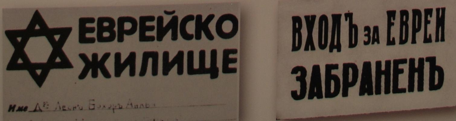 Согласно болгарским антисемитским законам на еврейские дома были повешены указатели их принадлежности (слева). Везде, где евреям был вход запрещён, висел знак, ограничивающий доступ (Справа). Снимок сделан в Музее Холокоста в Скопье, Республика Македония.