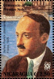 Почтовая марка, выпущенная в Никарагуа в 1995 г. в честь 70-летия со дня присуждения Джеймсу Франку Нобелевской премии по физике.