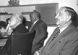 И. Клаузнер (крайний слева) на приеме в его честь, устроенном редакцией газеты «Едиот ахронот». Февраль 1956 г. Тель-Авив. Фото Х. Пинна. Государственное бюро печати. Израиль.