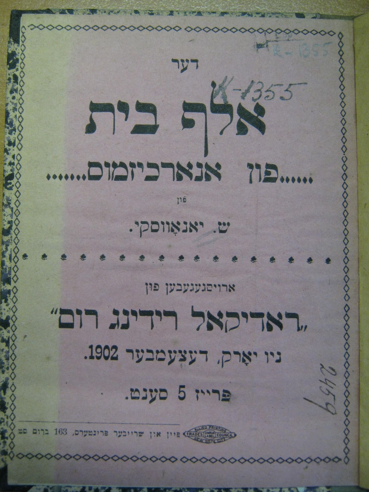 Ш.-Й. Яновский, брошюра "Алеф-бейс фун анархизмус". Издание "Радикал ридинг рум", Нью-Йорк, декабрь 1902